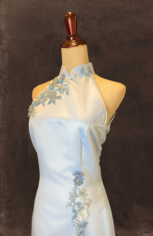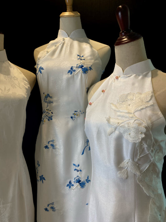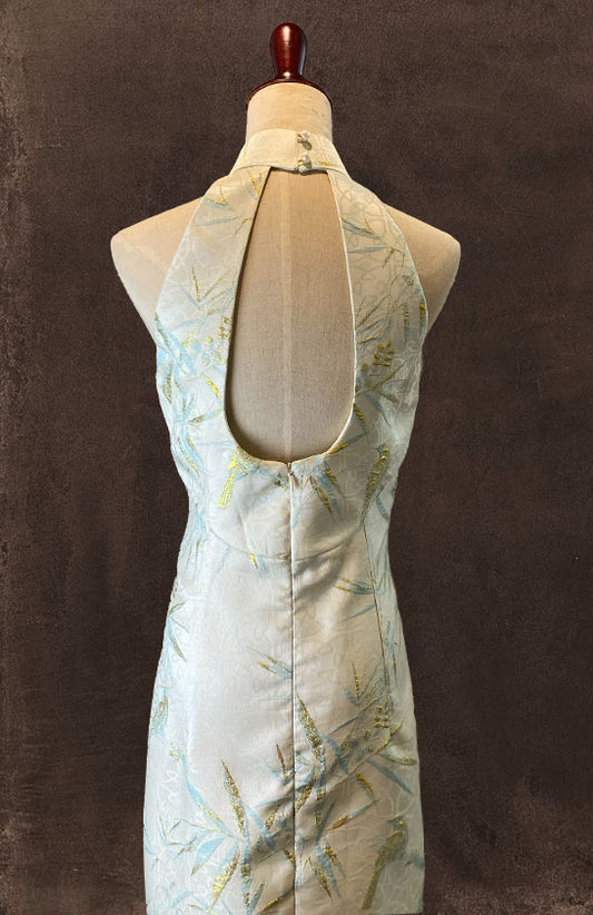 Cream Jacquard Halter Cheongsam with Toga Cutout and Open Back Detail