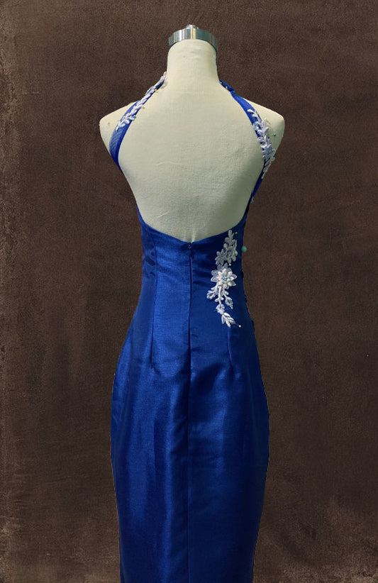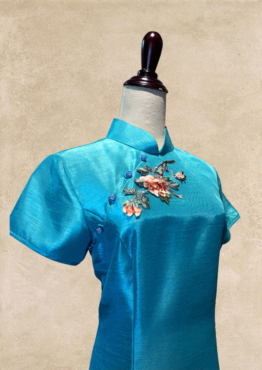 Cerulean Blue Thai Silk Cheongsam with Red Floral Applique