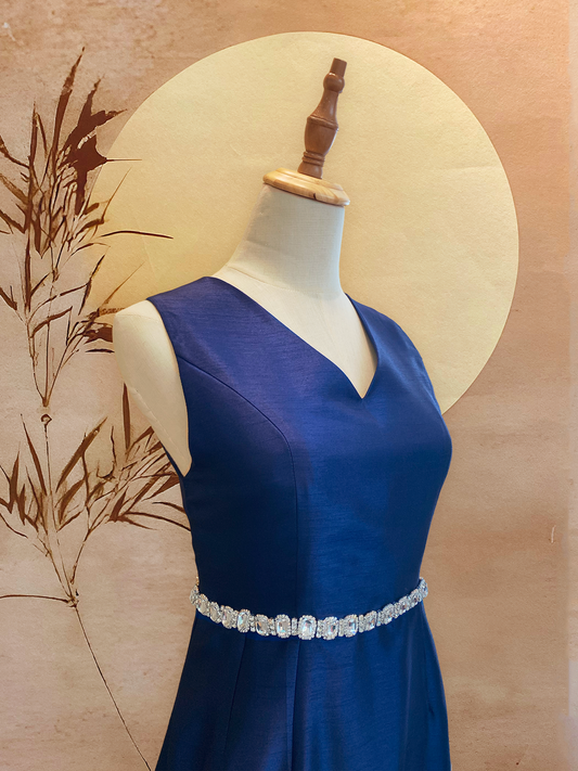 Navy Blue Thai Silk V-Neck Dress with Jewelled Waist
