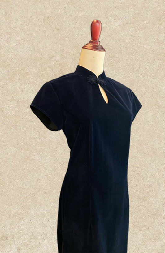 Navy Blue Velvet Cheongsam with Peep Hole