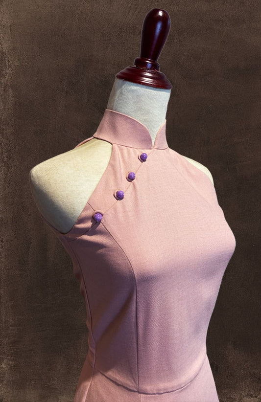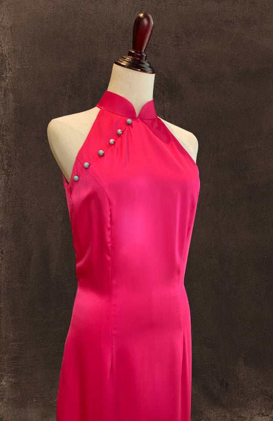 Pink Halter Cut Cheongsam In Satin