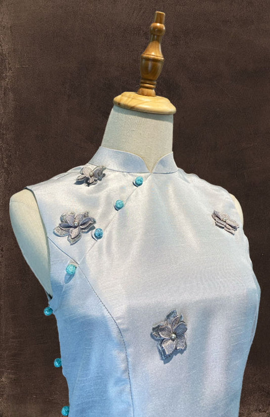 Light Silver Cheongsam with Silver Floral Applique