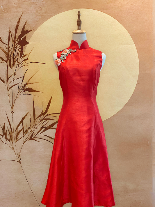 Red Thai Silk Flare Cheongsam with Floral Appliqué