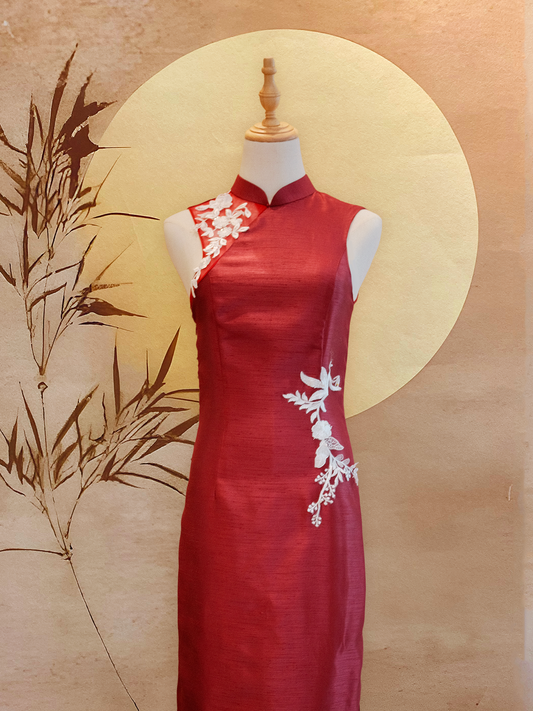 Red Thai Silk Cheongsam with White Floral Appliqué_
