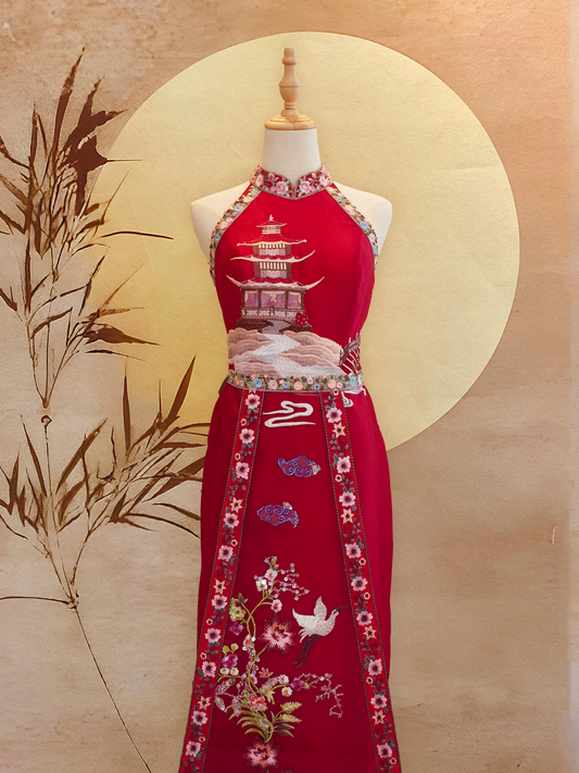 Red Sangjit-Style Dress with Oriental Embroidery