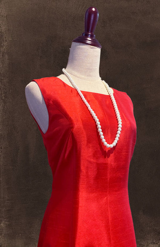 Red Thai Silk Boat Neck Flare Dress