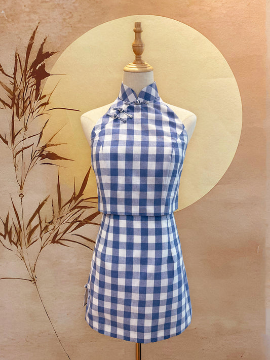 2pc Gingham Cotton Cheongsam Top and Skirt with Frog Buttons