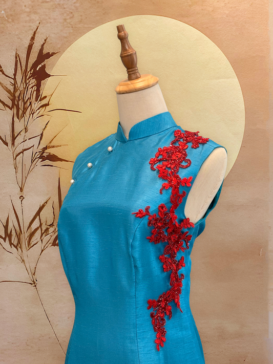Cerulean Blue Thai Silk Cheongsam with Red Floral Applique