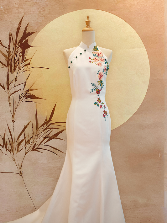 White Duchess Satin Cheongsam with Frost Flower Applique