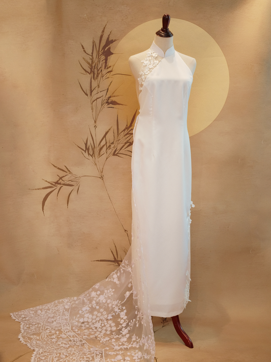 White Duchess Satin Cheongsam with Shoulder Mesh and Lace Train