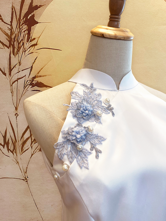 Light Blue Silk Satin Cheongsam with White Floral Applique