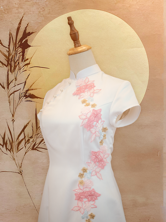 White Duchess Satin Cheongsam with Pink Floral Appliqué