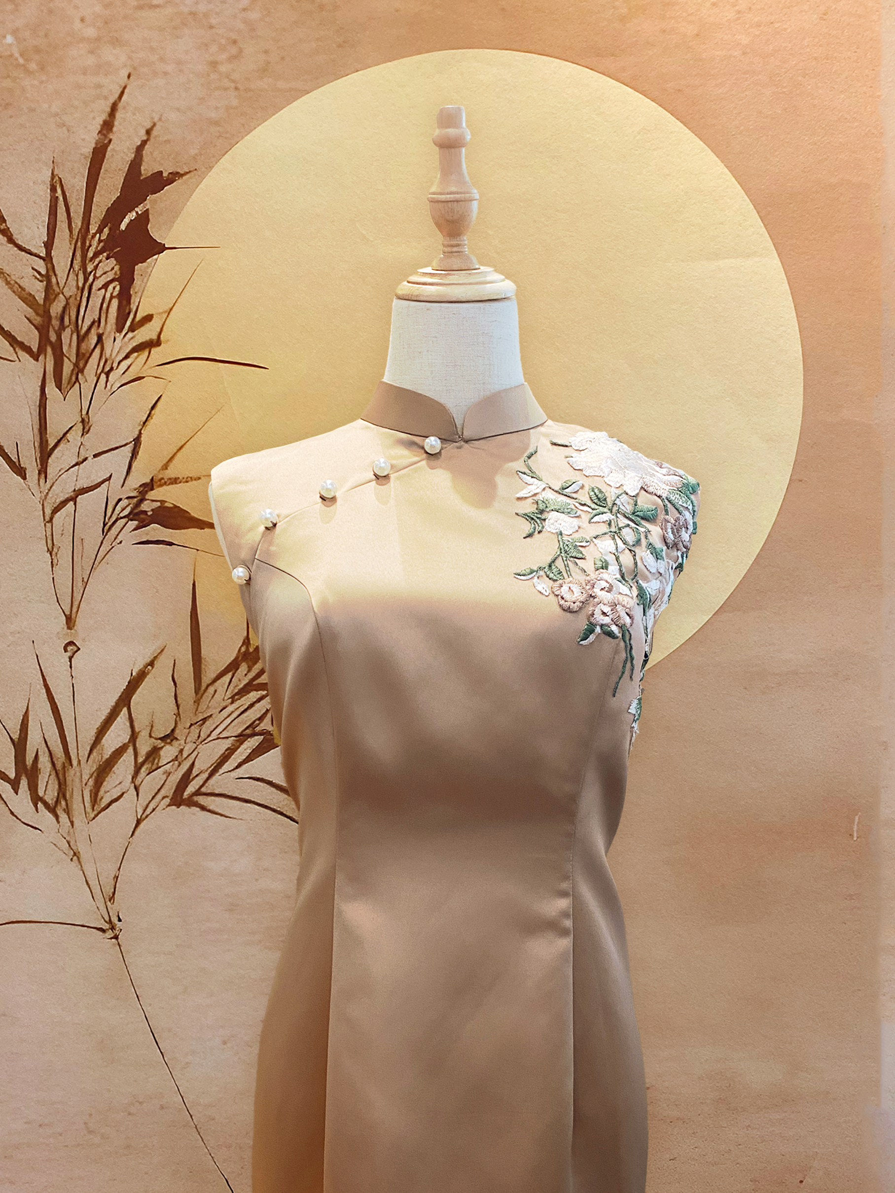 Taupe Satin Cheongsam with Floral Appliqué