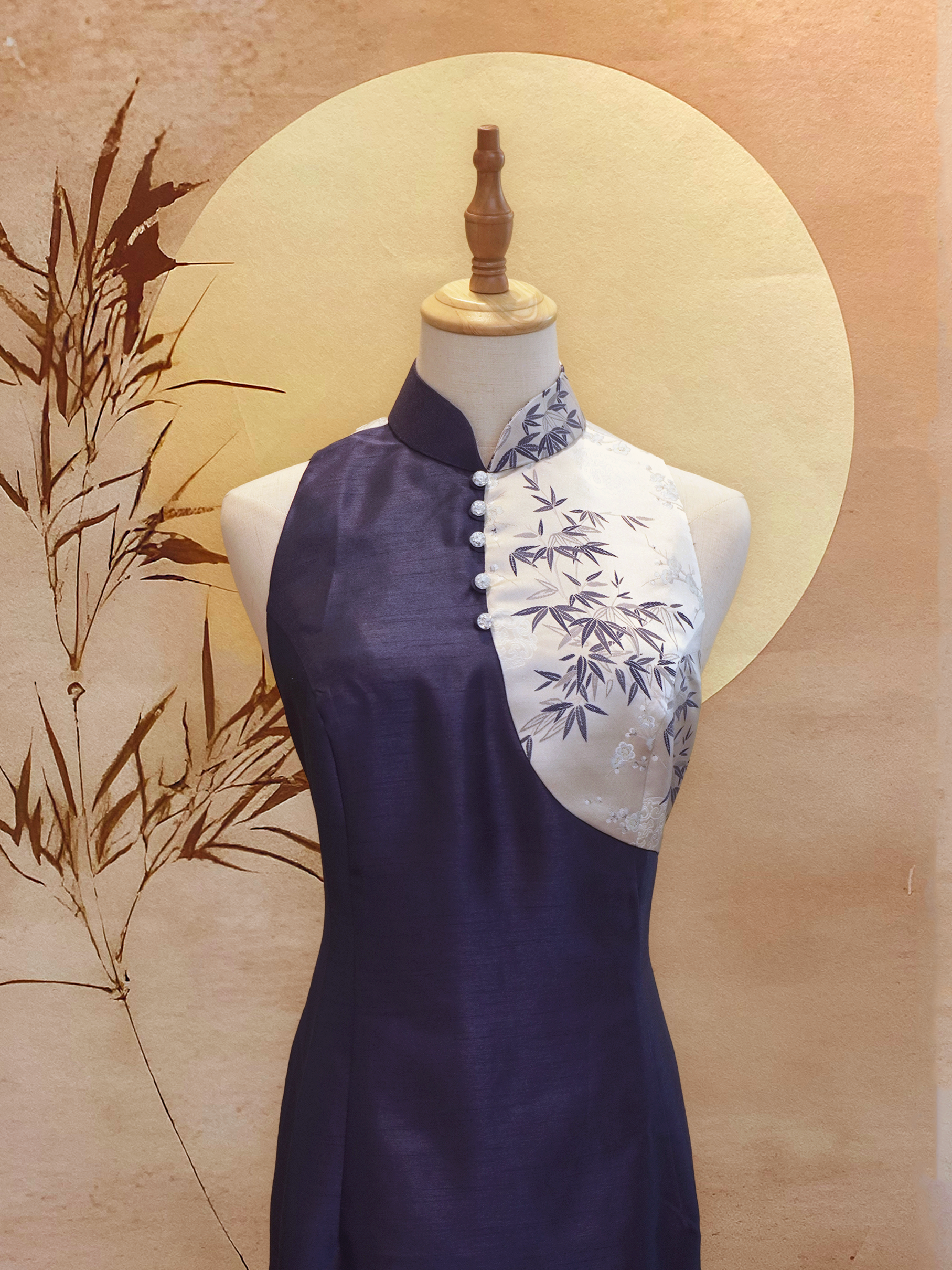 Midnight Thai Silk Cheongsam with Silver and Blue Jacquard Blocking