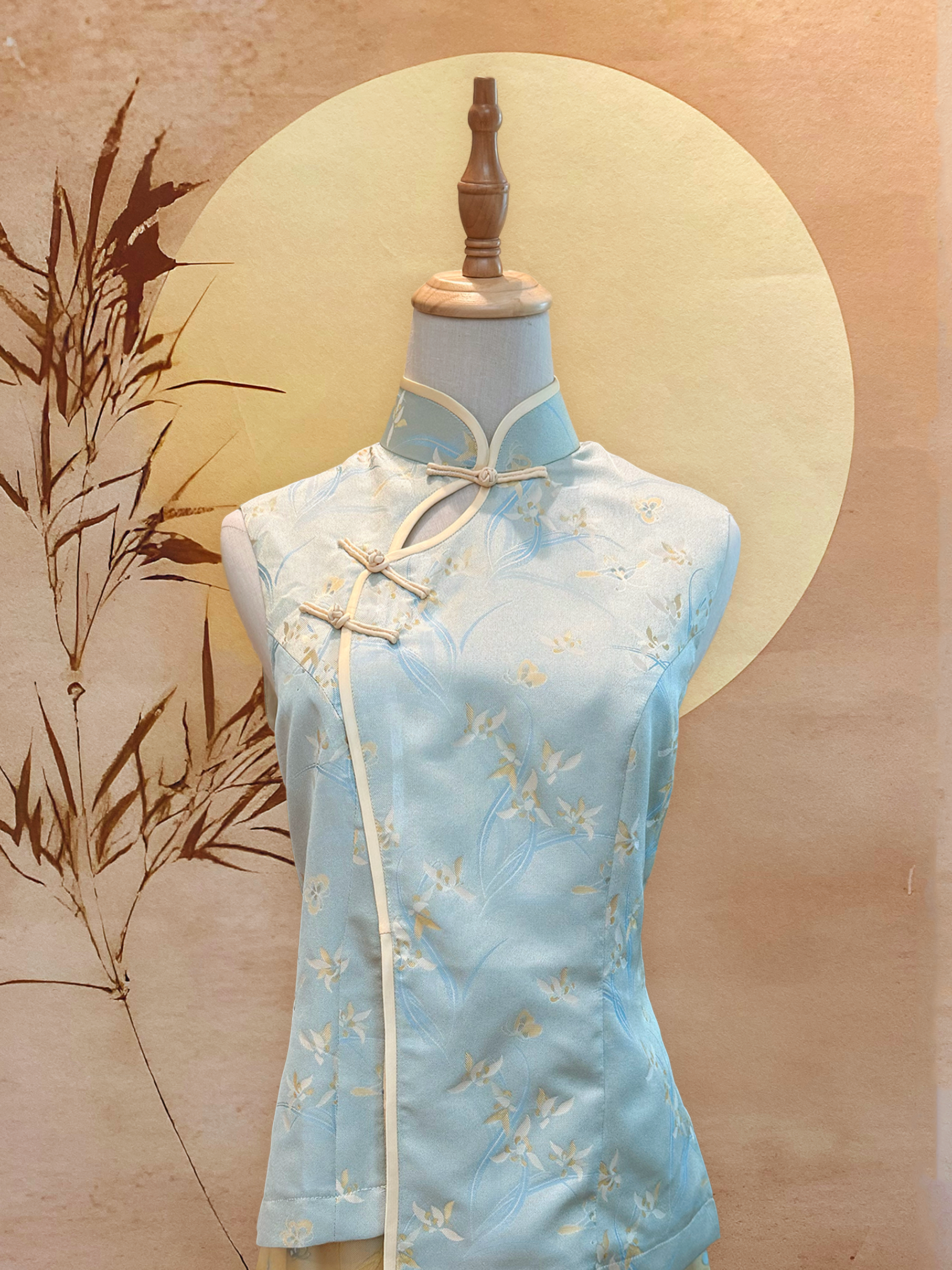2pc Mint and Yellow Chinese Jacquard with Gold Frog Buttons and Trimming