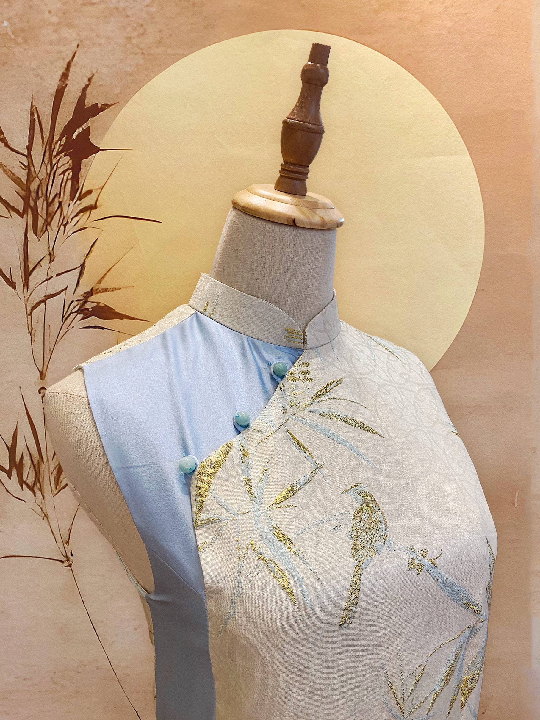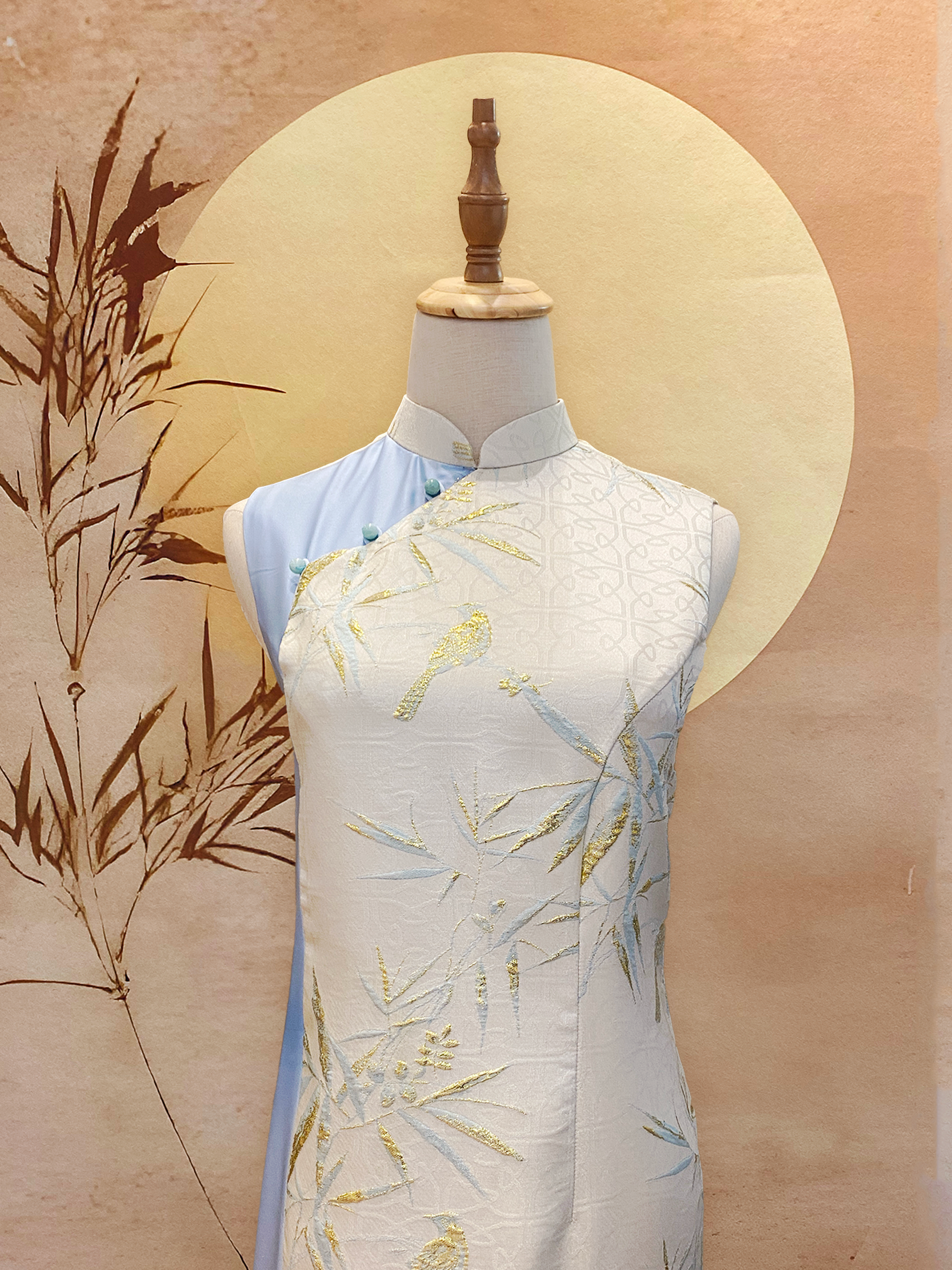 White Nature Jacquard Cheongsam with Blue Satin Side